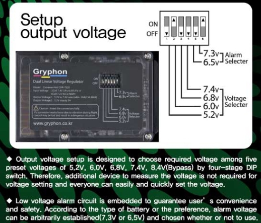 This regulator, is actively applied with rapidly changing RC environment such as popularizing trend of Extreme 3D flying, becoming bigger of the body and high performance of the servo from the product design stage, has been developed to focus on the quality and stability of power and the improvement of transient response of entire power system instead of traditional method which uses simple current capacity as a measure for designing a regulator. In addition, the safety as well as user's convenience are secured to add the alarm function for low voltage of the receiver battery.