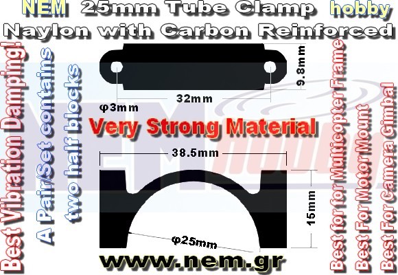 Plastic Boom clamps for 25mm diameter Tubes, they offer very good Anti-Vibration absorbance. they are almost 3 times lighter than aluminum clamps. Made by Nylon Reinforced with Carbon Fiber material and have high stress area. We suggest using them on the professional DIY multirotor frames, landing systems, gimbals or anywhere you need a better hardware. Very convenient for 3-axis DIY gimbals, Multicopters, etc.